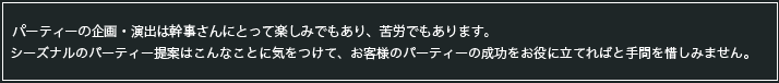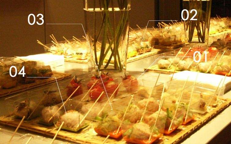 会社内での会議、打ち上げやセミナー等、また、イベントでのスタッフ様用お弁当の仕出しを始め、オフィシャルパーティからご自宅でのプライベートパーティ、少人数でのお食事会など、ご希望に合わせてフレキシブルに対応させていただきます。 また、お一人様ずつでの盛り付けや立食パーティ用のフィンガーフードなどのアレンジも可能ですので、ご相談ください。