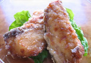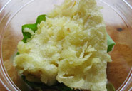 新鮮な鯛を有機の三つ葉を揚げで巻きました。
